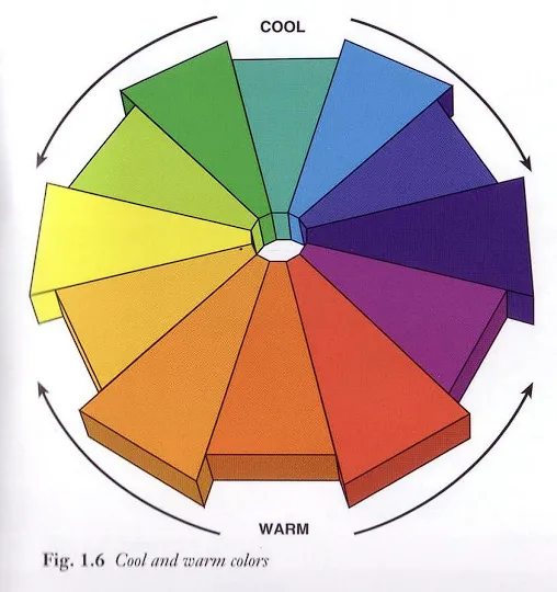 Colors are often referred to as either warm or cool. The colors on the color wheel are easy to separate into warm and cool colors. Red, orange, and yellow are considered warm while green, blue, and purple are described as cool. As colors become less pure, the terms warm and cool become more useful as relative comparisons rather than absolute descriptions.