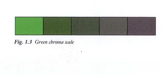 The third attribute of color is chruma, or saturation, the relative purity or intensity of a color determined by how much or how little gray is added to the color. The value of the colors on a chroma scale do not change; only the intensity of the color varies.
