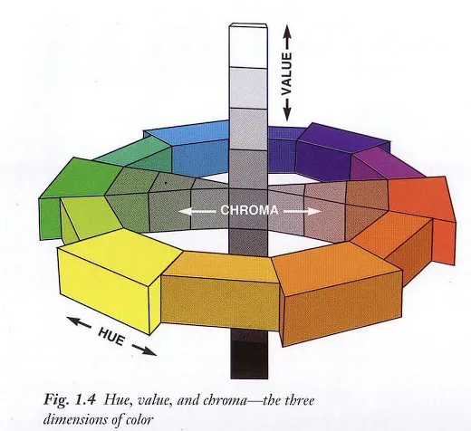 So, the three attributes of color-hue, value, and chroma-are what defines every color. Albert Munsell, the color theorist, describes each and every color as having three dimensions; therefore, to fully describe any color it is necessary to describe each of these dimensions or attributes.